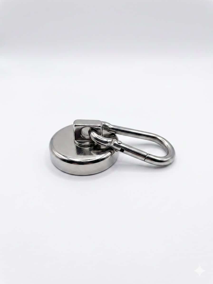 Der drehbare Karabiner ermöglicht ein schnelles Ein- und Aushängen ohne Werkzeug. Typische Einsatzbereiche sind Werkstatt und Lager (Werkzeuge, Kabel, Zurrgurte aufhängen), Messebau und Ladenbau (Banner, Schilder, Dekorationen an Stahlträgern), Camping und Outdoor (Ausrüstung an Fahrzeugkarosserien oder Metallrahmen), Haushalt und Küche (Töpfe, Utensilien an magnetischen Oberflächen). Der Karabiner lässt sich bei Bedarf herausschrauben — die M5-Gewindebuchse erlaubt auch den Einbau anderer Haken oder Ösen.