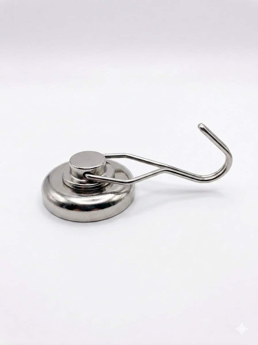 Der drehbare Hakenmagnet SNG25E Ø25mm ist der kompakte Allrounder für Haus und Werkstatt. Der Stahldraht-Haken dreht sich 360° frei und ist beliebig neigbar — er folgt automatisch der Zugrichtung des hängenden Gegenstands. Ideal für Decken, Schrägen und überall dort, wo ein starrer Haken abrutschen würde.