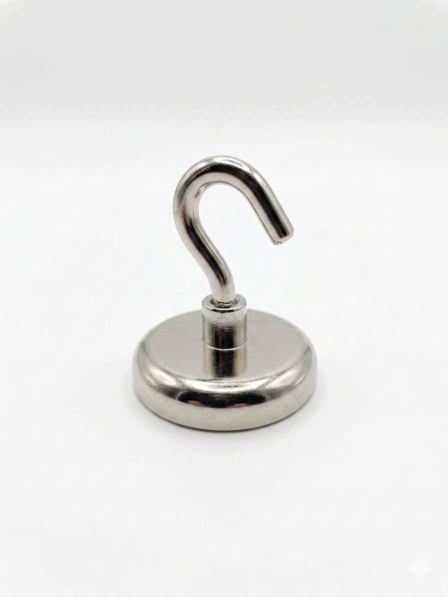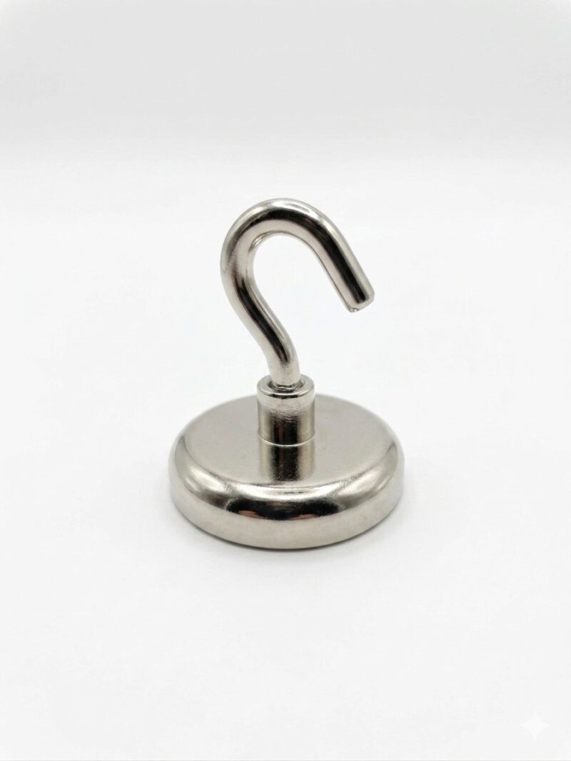 Der GRE42 Neodym-Hakenmagnet Ø42mm ist der große Bruder des GRE32. Der im Stahltopf gebündelte Neodym-Kern (N35) erzielt bis zu 43 kg Haftkraft bei direktem Kontakt auf Stahl. Der einschraubbare M6-Rundhaken lässt sich in Sekunden montieren und entfernen — kein Bohren, kein Kleben.